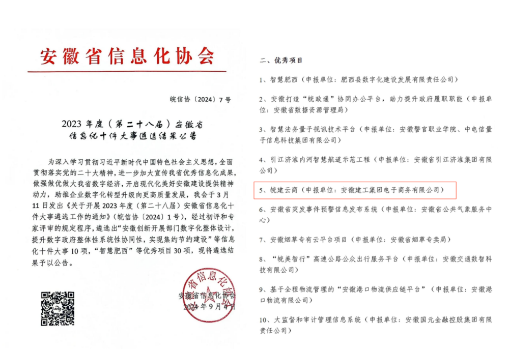 近日,安徽省信息化協(xié)會(huì)公布了2023年度(第二十八屆)安徽省信息化十件大事遴選結(jié)果,由建工商貿(mào)物流電商公司申報(bào)的“皖建云商”經(jīng)過(guò)初評(píng)和專家評(píng)審,成功入選2023年度安徽省信息化十件大事優(yōu)秀項(xiàng)目。