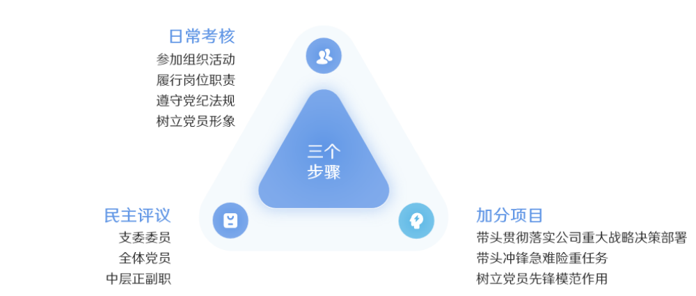 遵循“實事求是、立足崗位、獎優(yōu)罰劣、民主公開”的原則,設(shè)置日常考核、民主評議和加分項目三個部分,對黨員綜合表現(xiàn)進(jìn)行客觀評價。其中,日常考核聚焦參加組織活動、履行崗位職責(zé)、遵守黨紀(jì)法規(guī)、樹立黨員形象四個主要方面,設(shè)置扣分項目,對黨員履行基本義務(wù)提出明確要求。加分項目重在激勵黨員干部帶頭貫徹落實公司重大戰(zhàn)略決策部署、帶頭沖鋒急難險重任務(wù),樹立黨員先鋒模范作用。